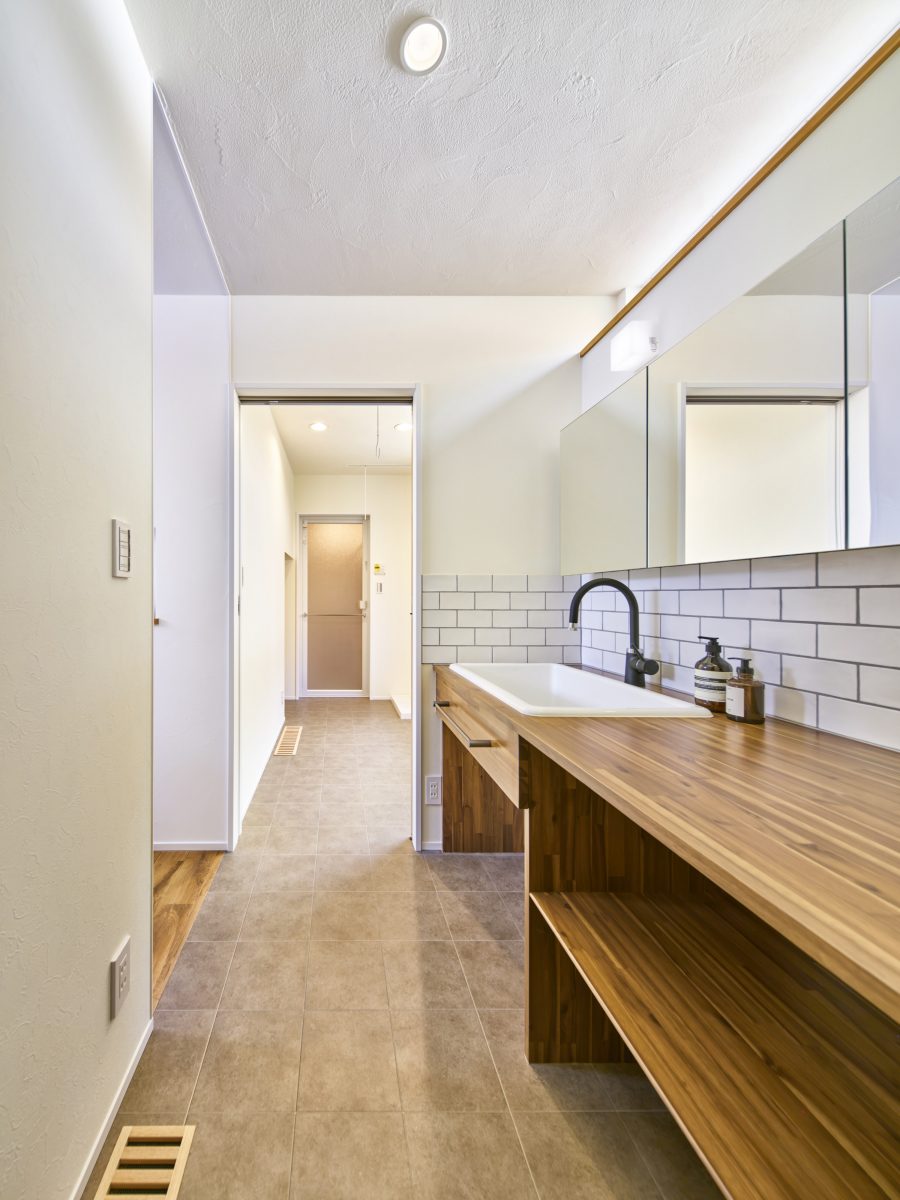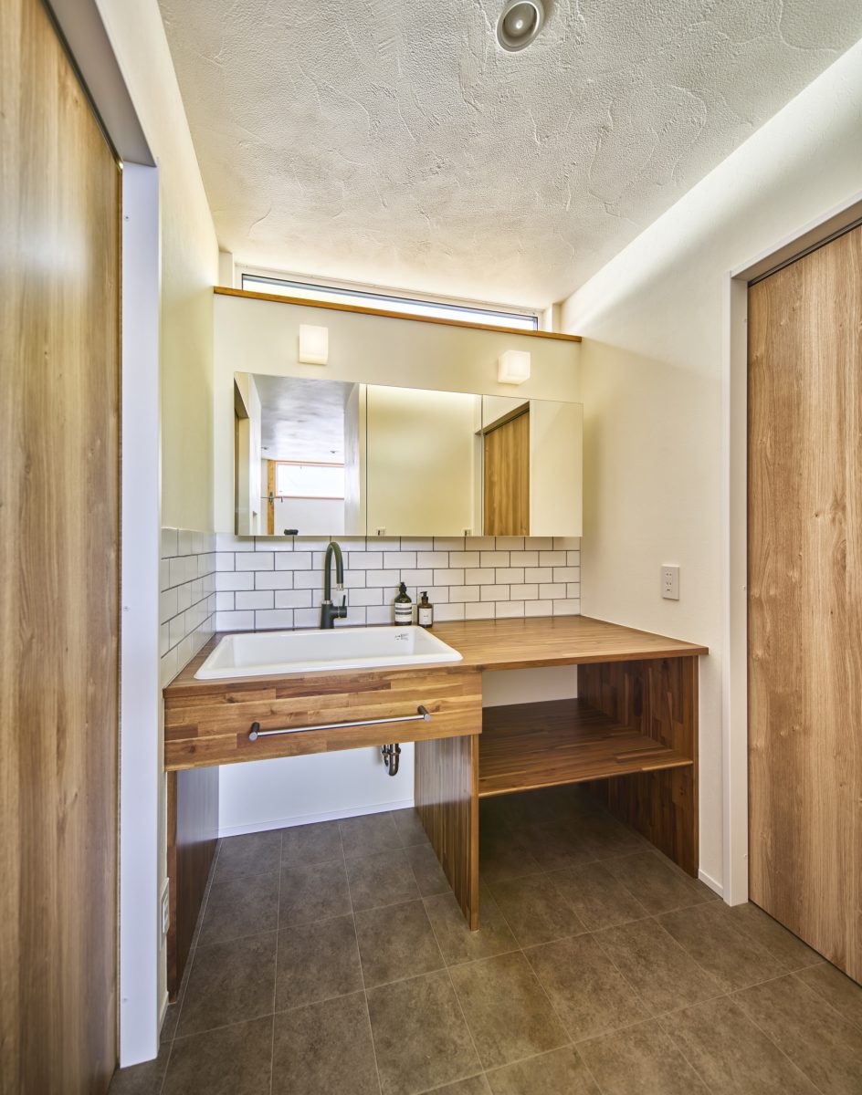 タイルや上部の明かり採りの窓など、こだわりの洗面スペースです。