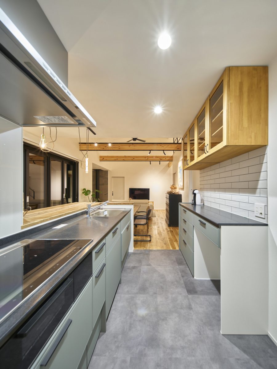 そして、キッチンはリビングを向くのではなく、横に見ながら、キッチン、ダイニングテーブル、リビングの