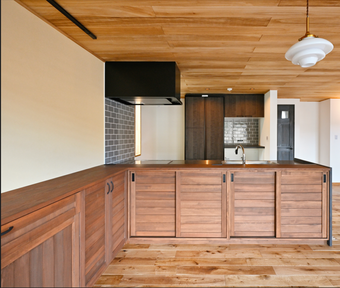 対面キッチンのカウンターの高さと幅に合わせてL型の造作家具を造りました。