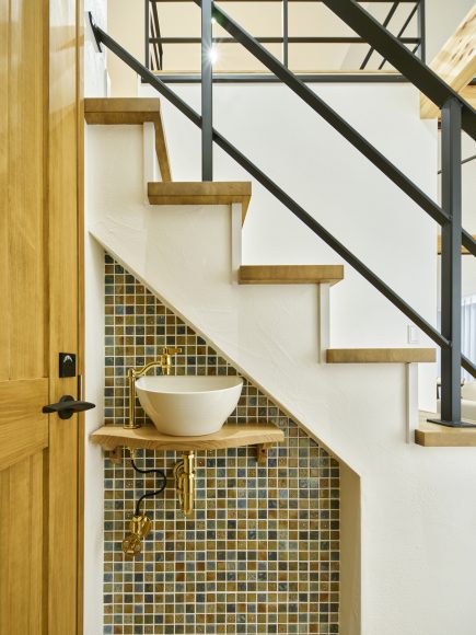 階段脇の空間を活かして設けた、コンパクトな手洗いコーナー。