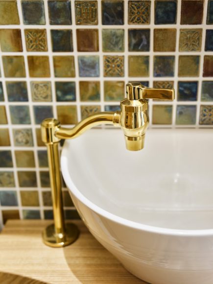 ゴールドの金物がタイルの色味と調和し、温かみのある雰囲気に仕上がっています。