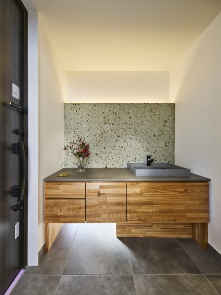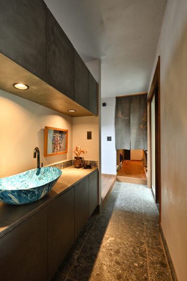 電球色(オレンジ色の光)の照明や間接照明も使い、大胆な洗面台にデザインされています。