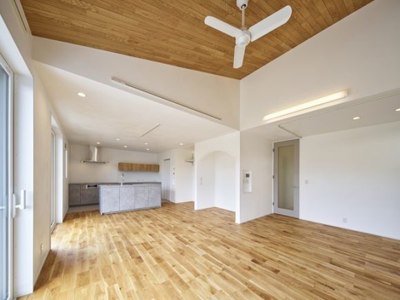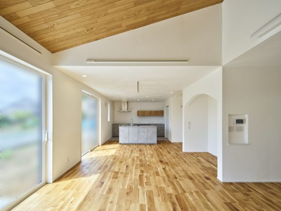 リビングスペースの天井は勾配天井にし、解放感をプラスしました。