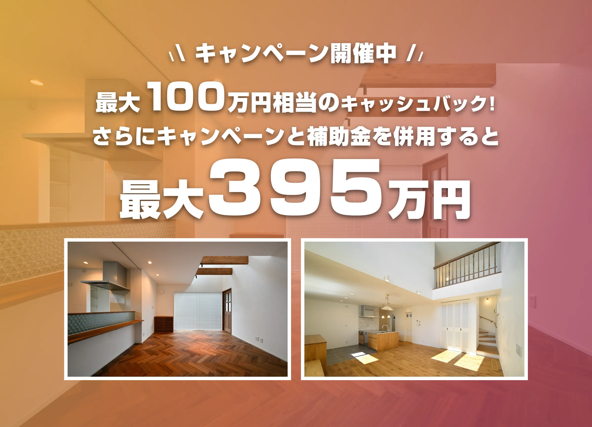 - 内容|新築の工事から、最大100万円相当をキャッシュバック