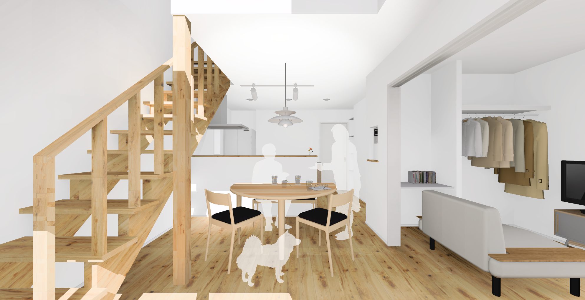 玄関とリビングの間には建具を設けず、ワンルームとしております。