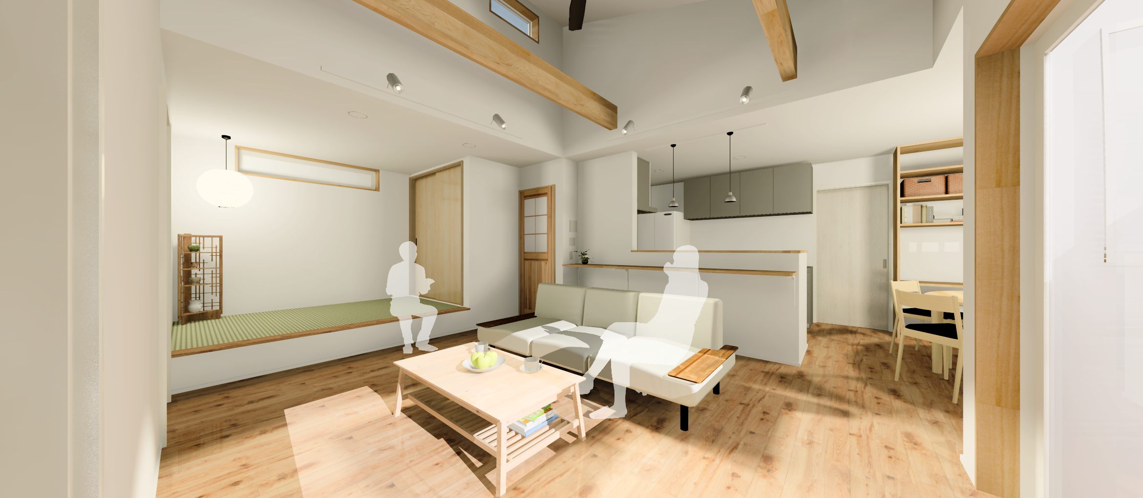 勾配天井と梁あらわしのLDKに、床下エアコンとオール電化を採用し、やさしい快適性と省エネルギー性を備えた住まいです。