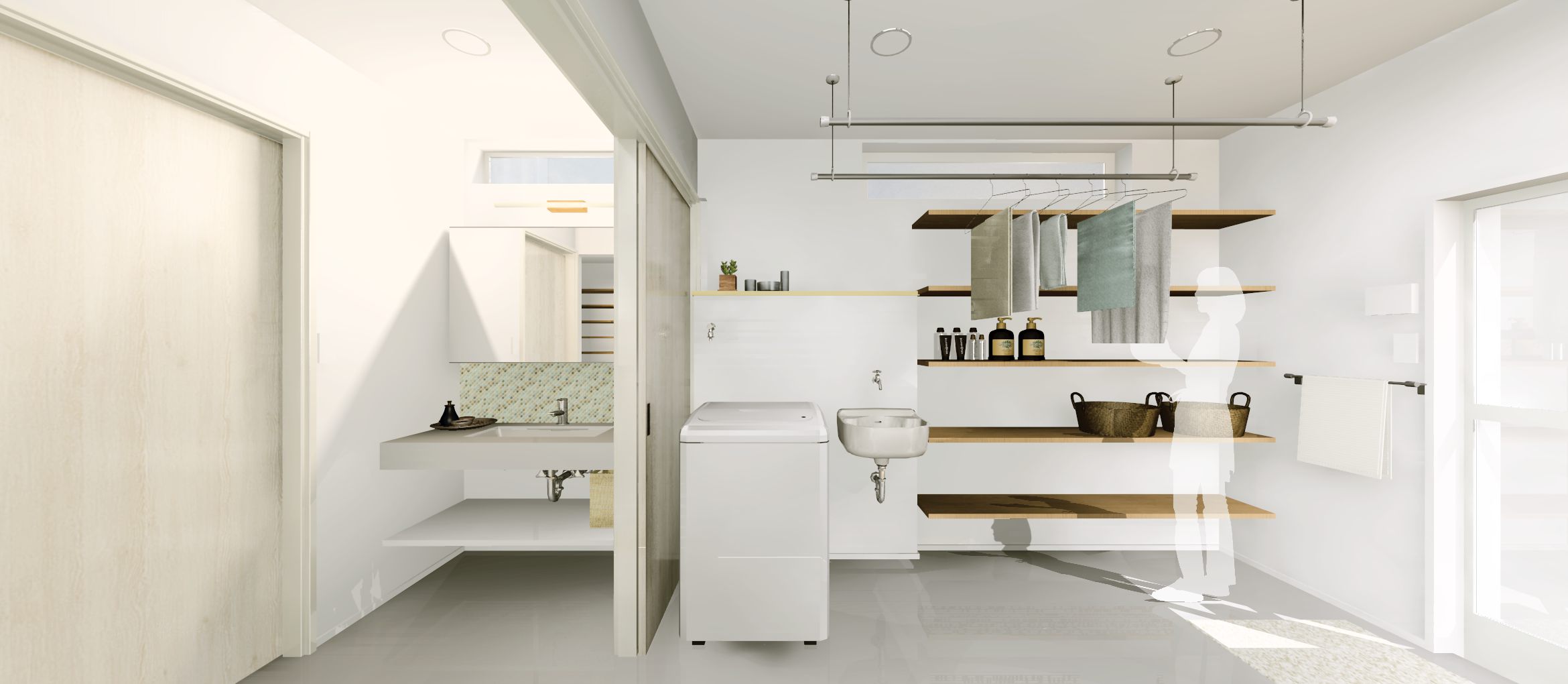 室内物干しを設置することで、天候に左右されず洗濯から乾燥までを行える計画としています。