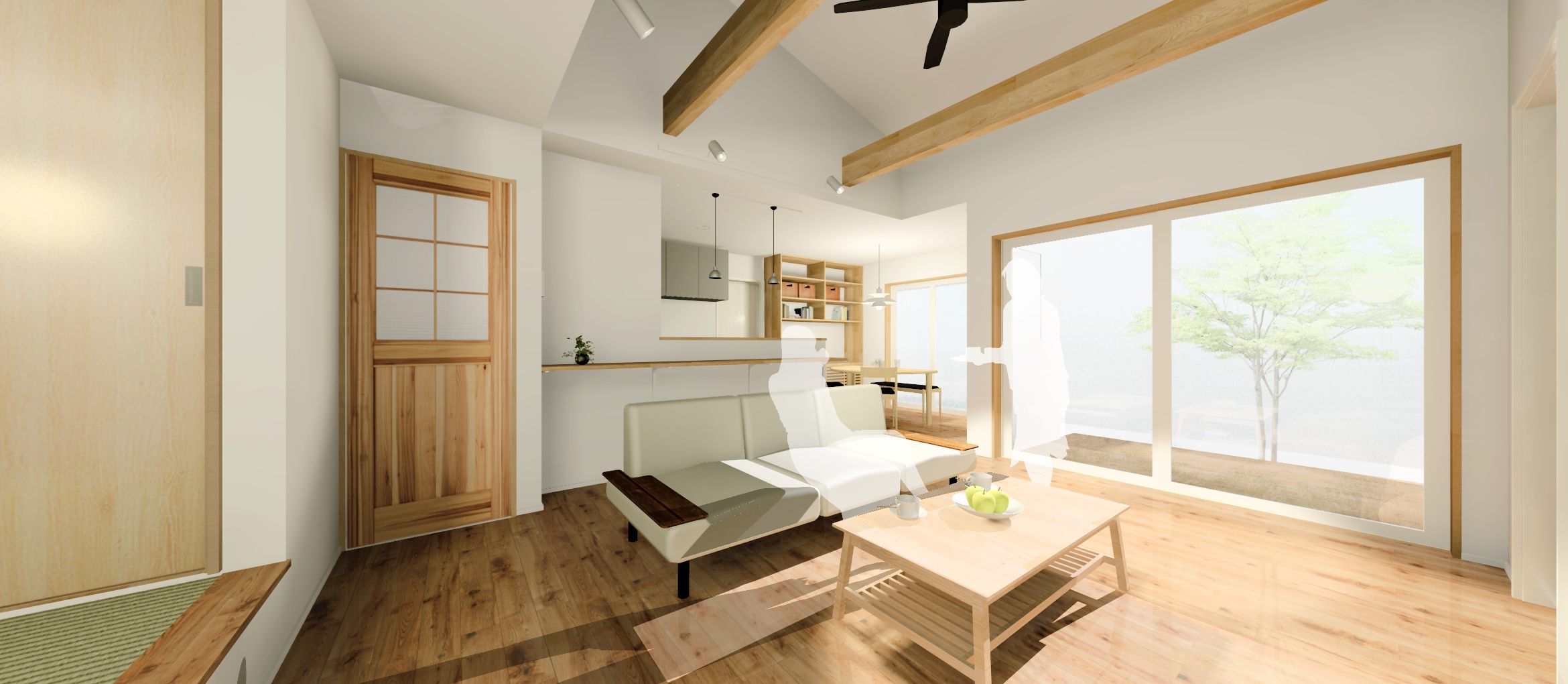 一部勾配天井としたLDKは、梁あらわしのデザインによりナチュラルで広がりのある空間構成としています。