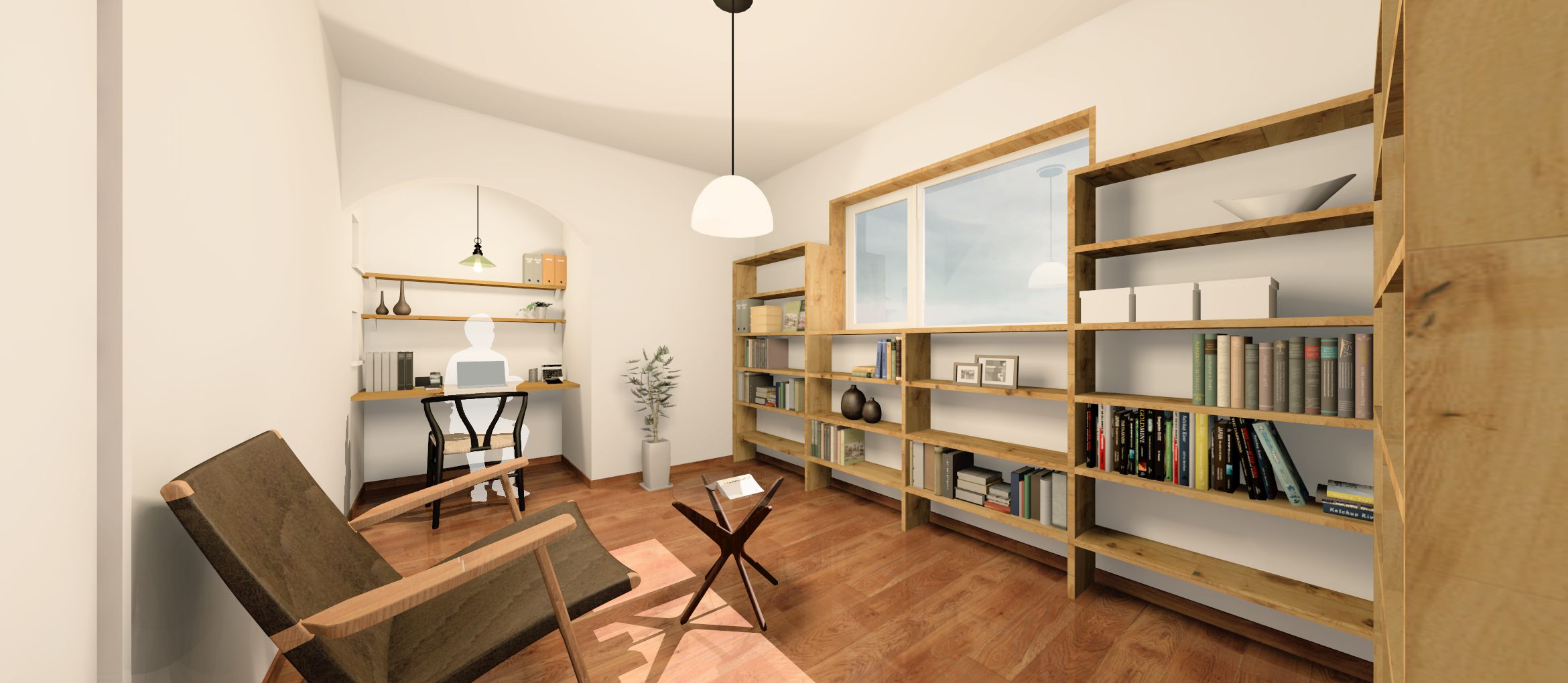 壁面いっぱいに造作した本棚は、窓まわりまで無駄なく納め、収納量と納まりの美しさを両立しました。