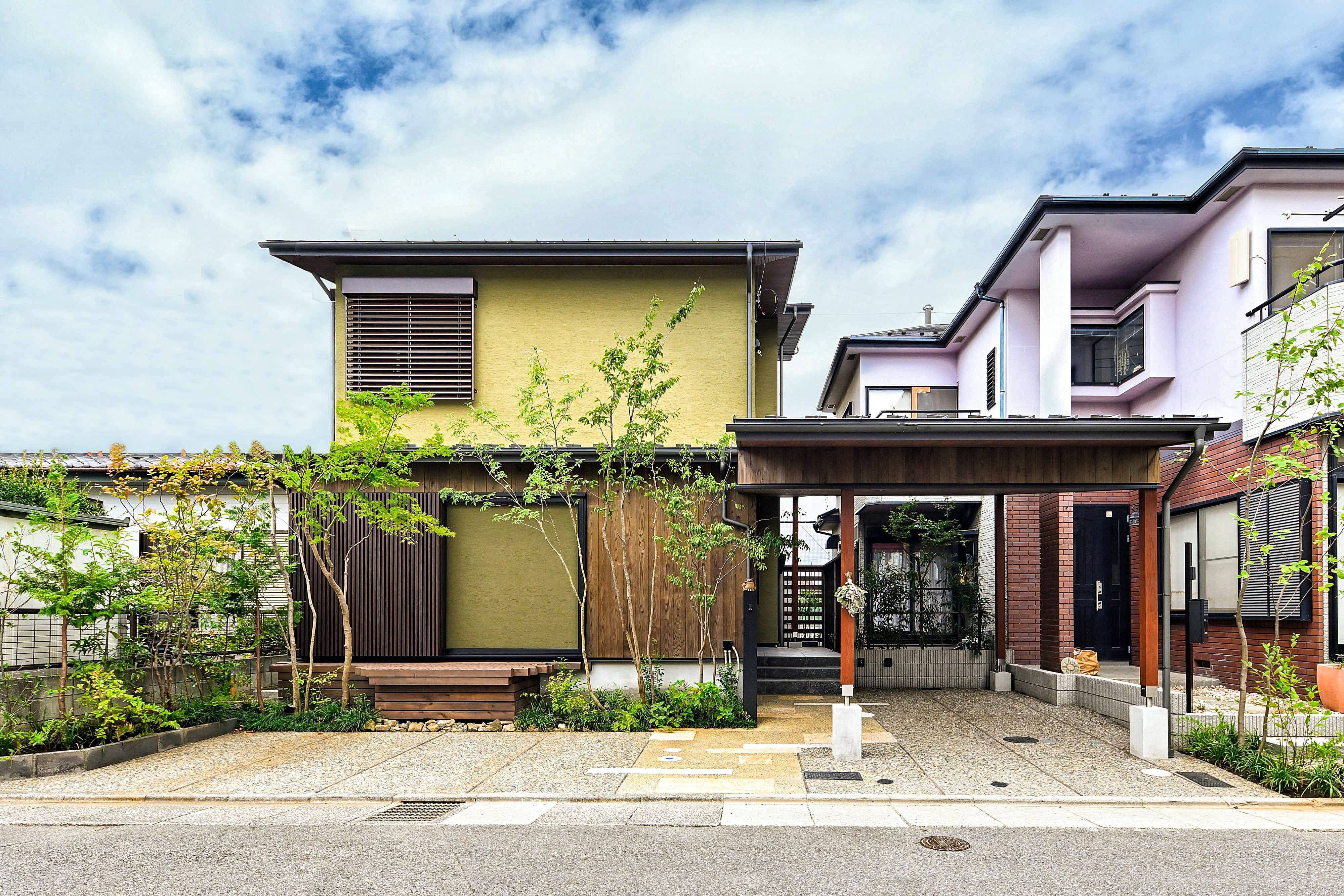また、性能と同じくらいデザインもこだわりました。特に外壁の色味に関しては何百色とある中で希望に一番近い苔色を選択。外観に使用した木材の色味や周りの植栽ともマッチしています。