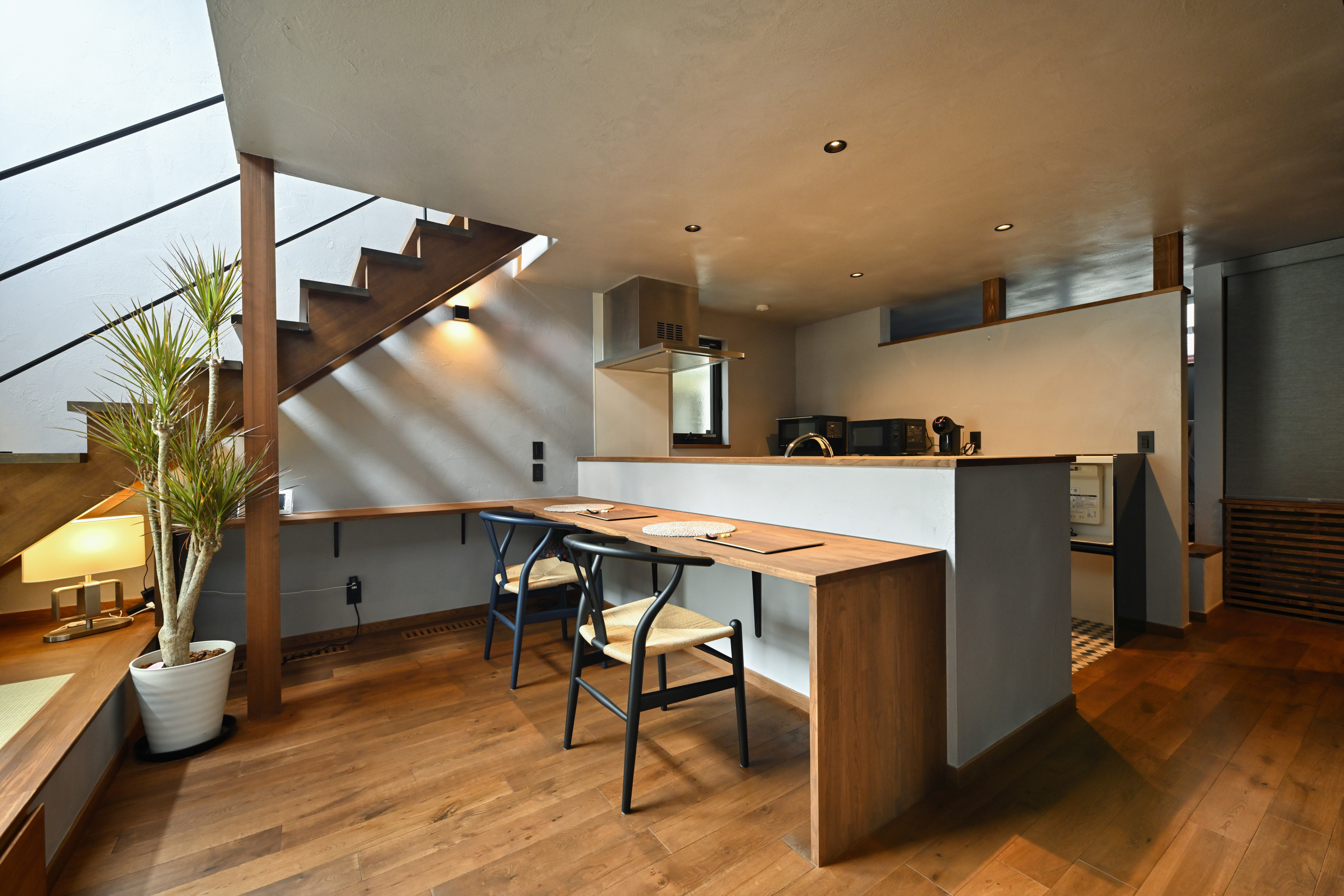 【ダイニング】2人暮らしにちょうどいいカウンターの造作ダイニングテーブル。キッチンが目の前のため準備や片付けがスムーズです。