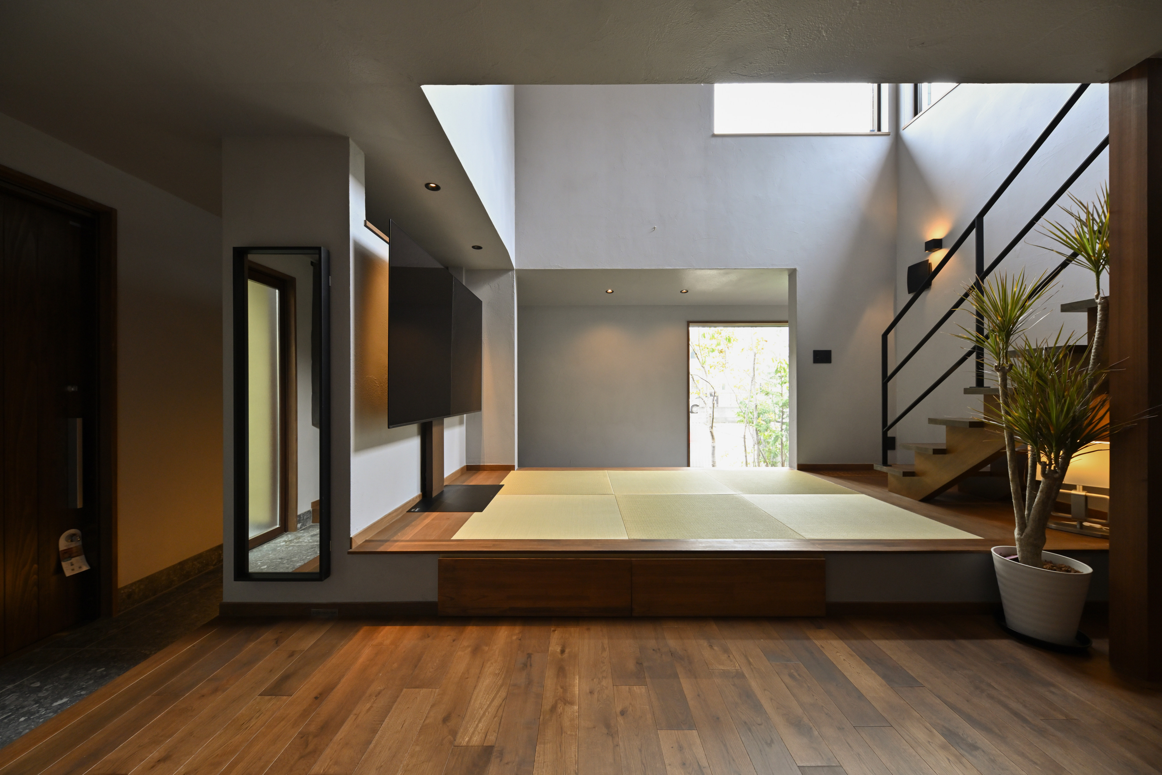 【畳リビング】小上がりになっているので畳の下には収納スペースができ、腰かけるのにもちょうどいい高さがあります。畳の奥は玄関から土間続きになっていて趣味の自転車整備をする予定です。