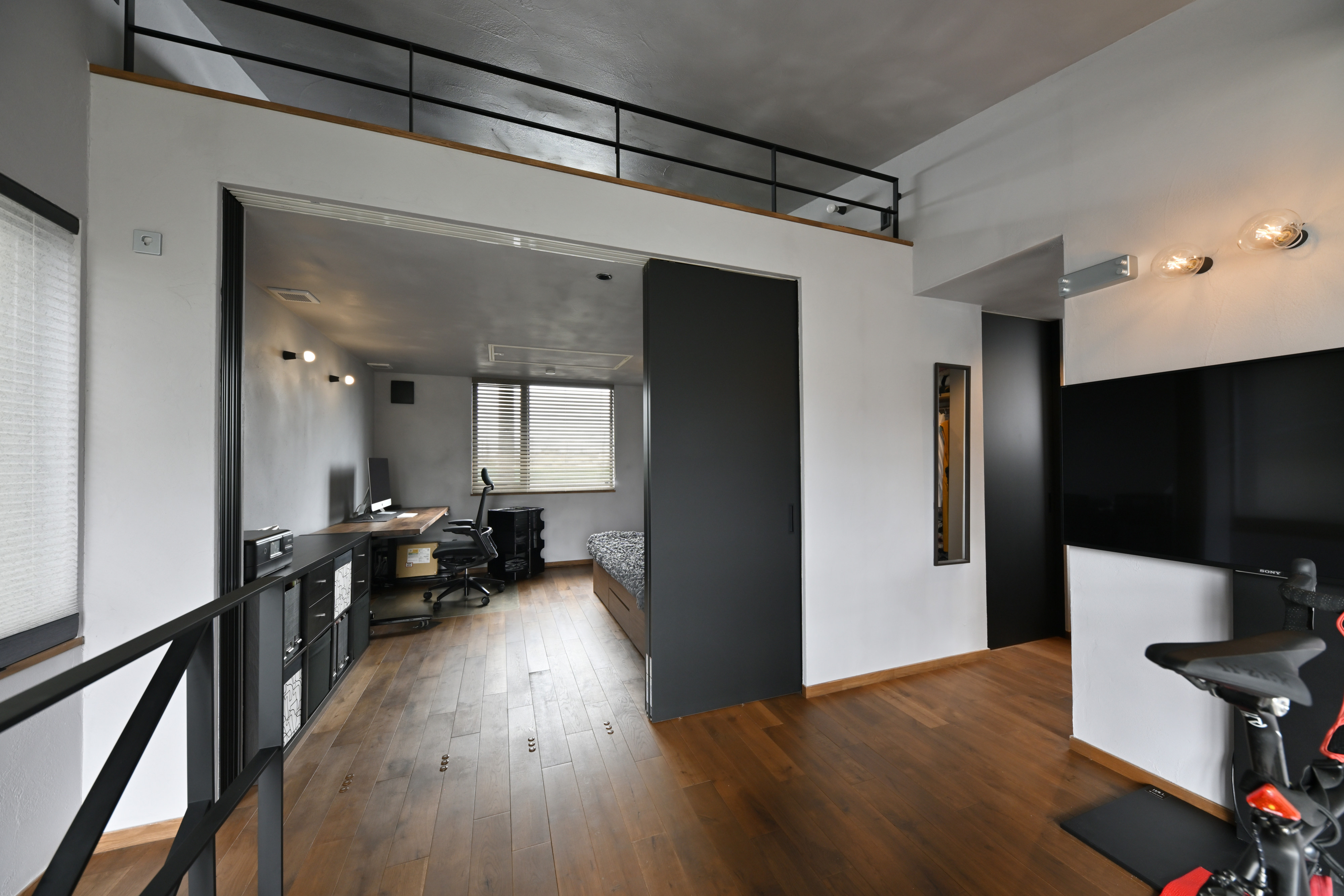【自室+ロフト】仕事部屋も兼ねた寝室。入口はほぼ全面引き戸なので開ければ開放感がでて部屋が広く感じます。