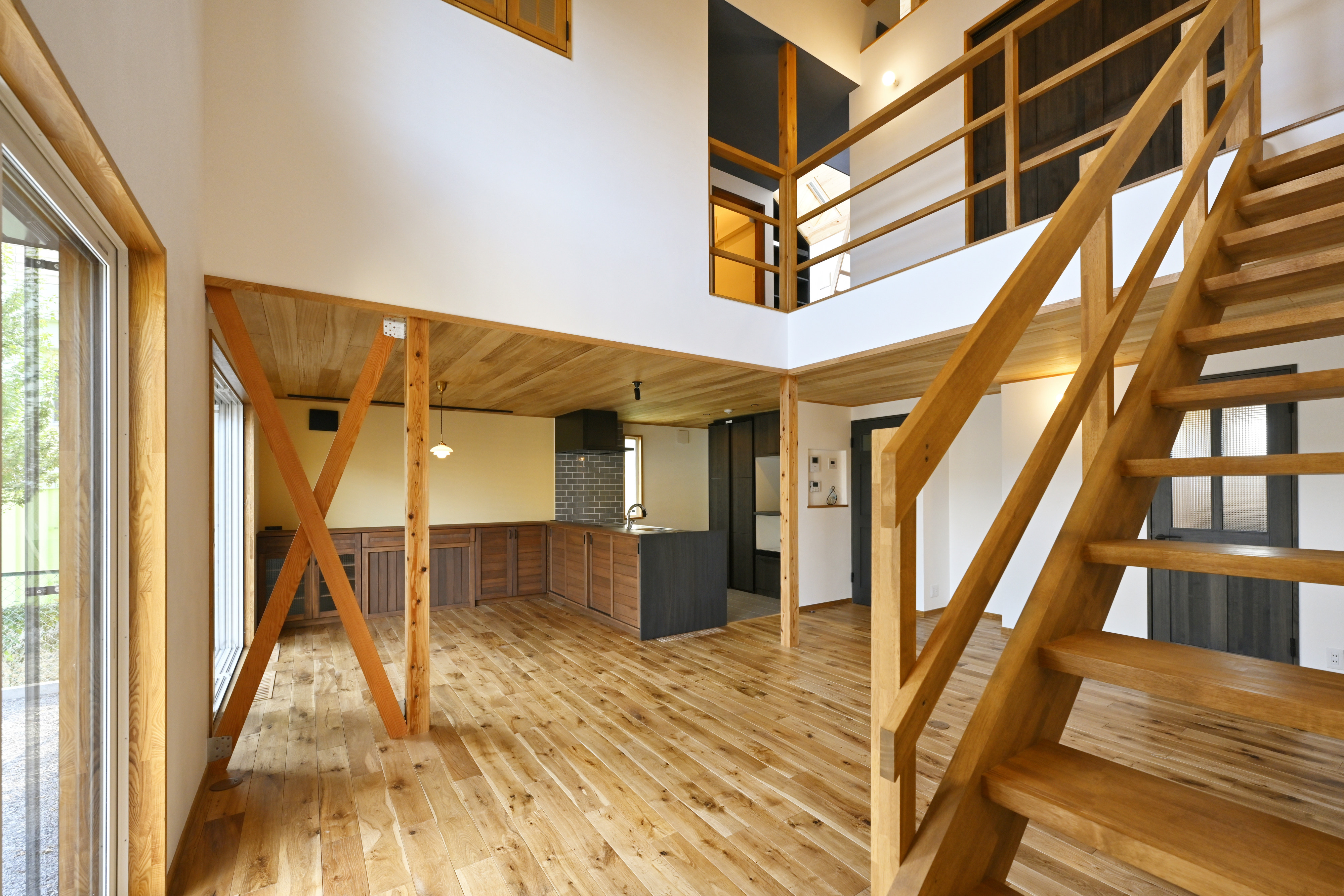 柱を見せるデザインのLDK。柱があるだけで仕切りの役割になりますが、壁のような圧迫感は軽減されます。手すりや階段も木材を採用。