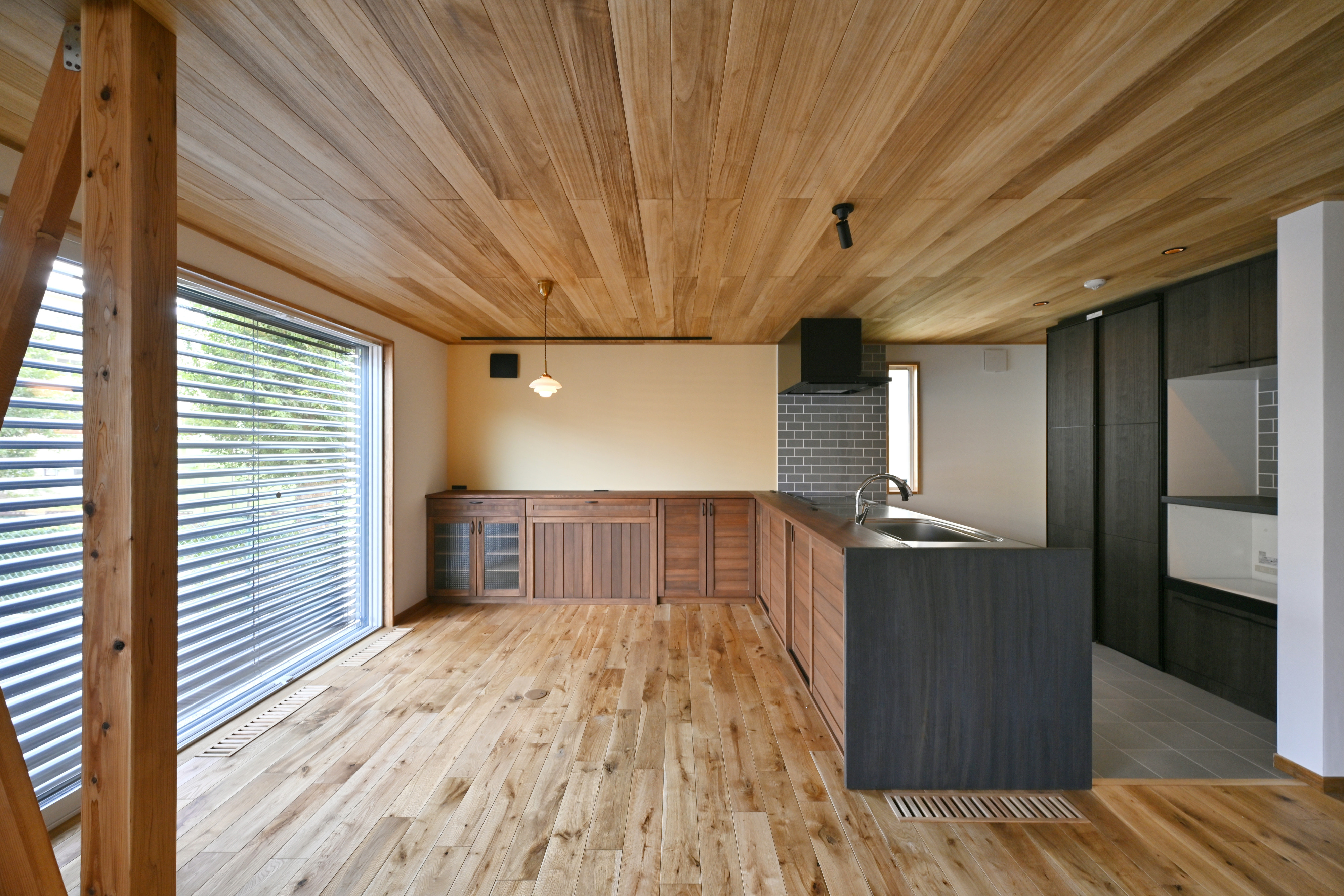 より落ち着いた空間にするため天井を低くしたダイニングキッチン。板張り天井で重厚感UP。キッチン前には棚を造作。棚の中には床下エアコンが格納されています。
