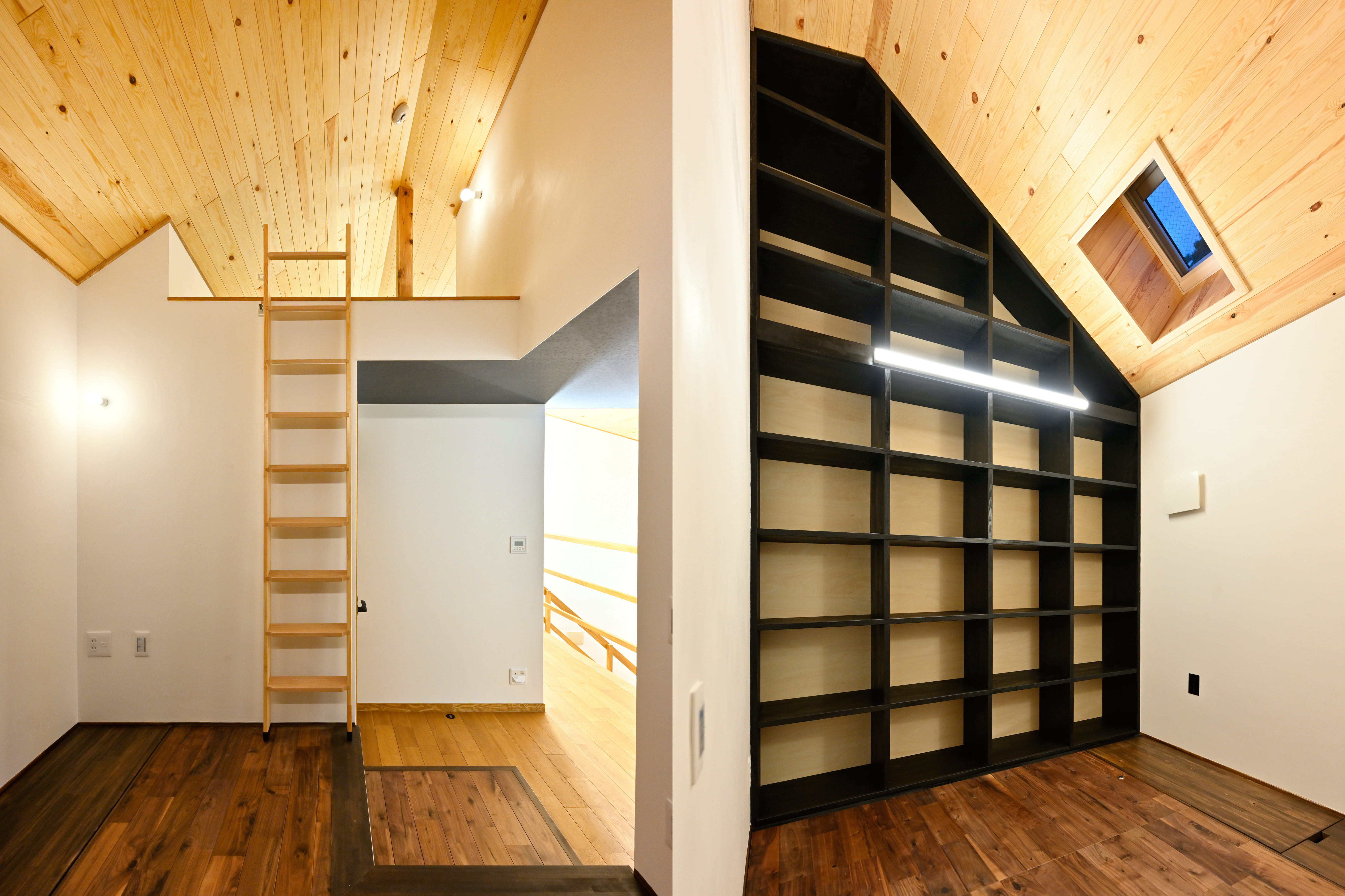 勾配天井の書斎。本棚は天井まであるので収納量抜群です。こちらには小屋裏エアコンのあるロフトにつながるハシゴがあります。