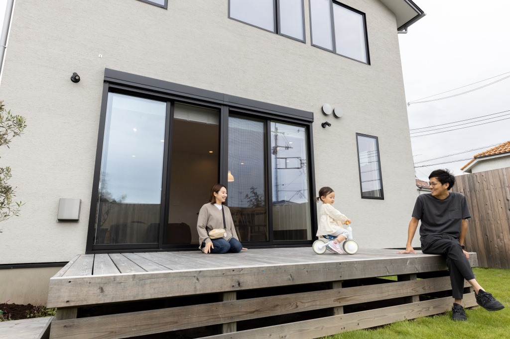 【外観】南面に大きなウッドデッキを設け、家族団らんを楽しめます。