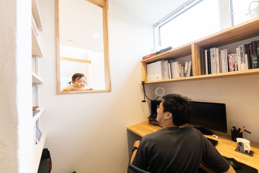 【書斎】家族の存在を感じながら仕事ができる書斎。程よい広さで、収納を確保しつつ、必要なものはすぐに手が届きます。